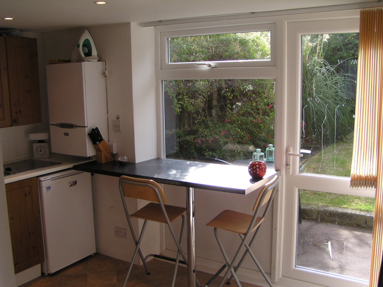 Breakfast Bar Looking Into Garden 2 Colourful Stools Kitchen